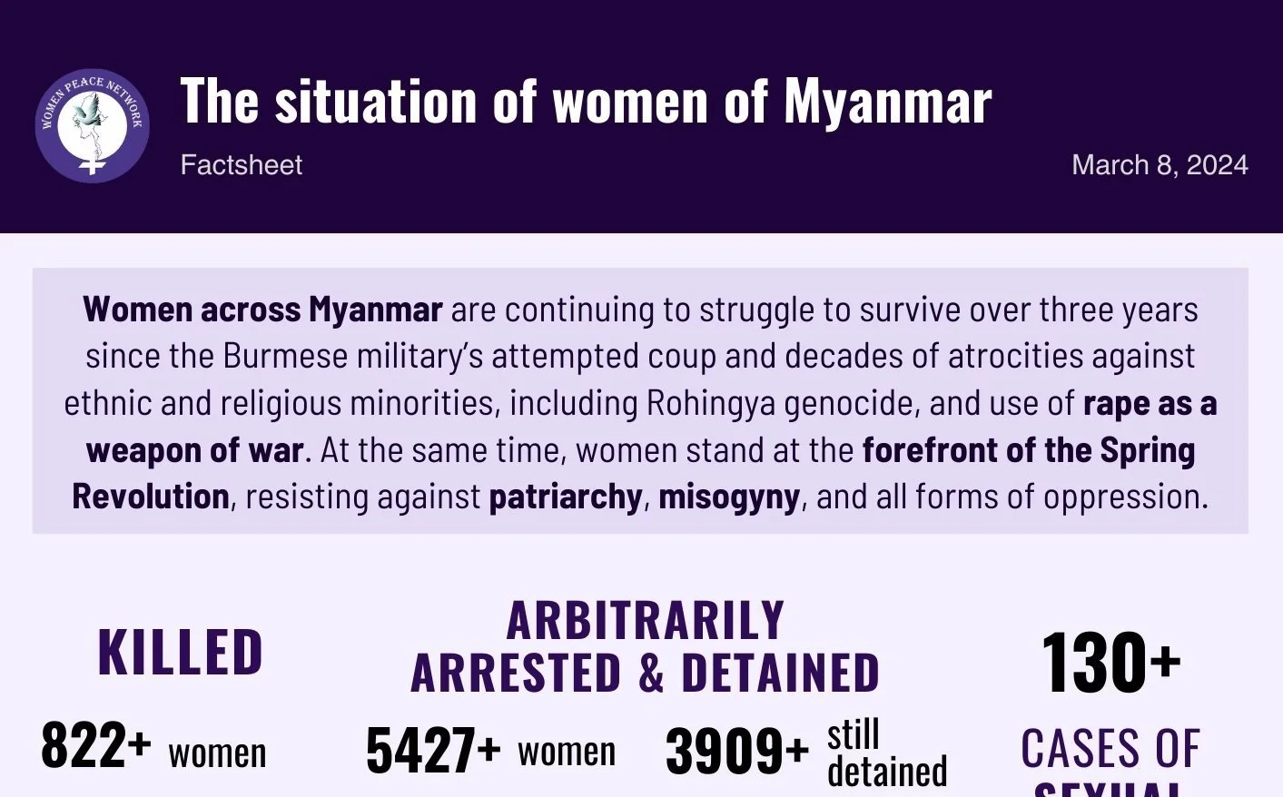 This briefer describes the situation of women and girls since the Myanmar military and security forces’ coup attempt on February 1, 2021 and its ensuing humanitarian crisis, and their systematic and widespread attacks of violence – extrajudicial killing, arbitrary arrest and detention, and torture and sexual violence – against this population in particular.